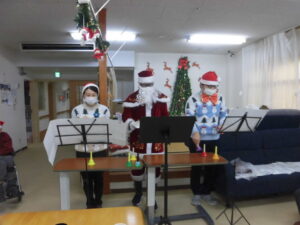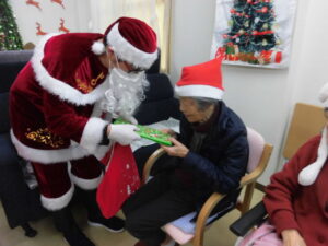 職員によるハンドベルでの讃美歌演奏や、サンタクロースからのプレゼントに、大喜びの利用者様でした。